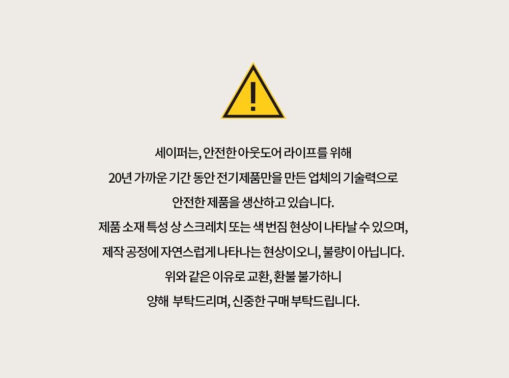 - 제품 특성상 단순 변심, 부주의에 의한 제품 손상 및 파손, 사용 및 개봉한 경우 교환/반품이 불가합니다.